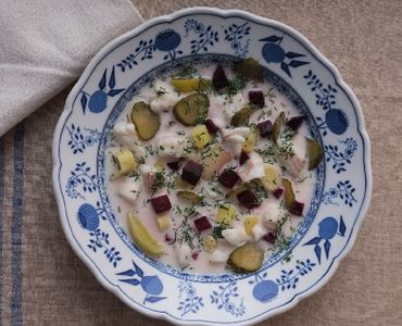 Clean the leek and cut it into fine rings. In a pan in the butter approx. 5 min. steam gently. Cut the pickled cucumber into slices, dice the beetroot like potatoes.